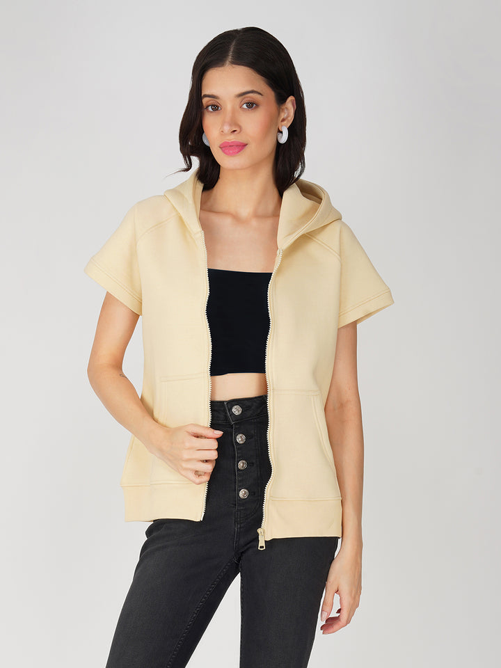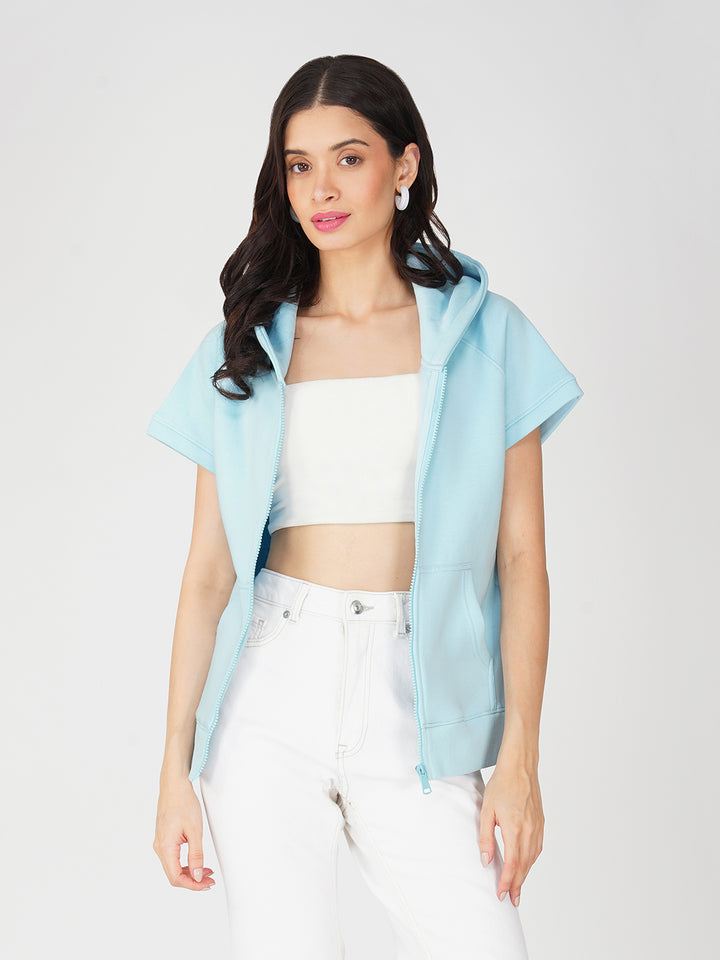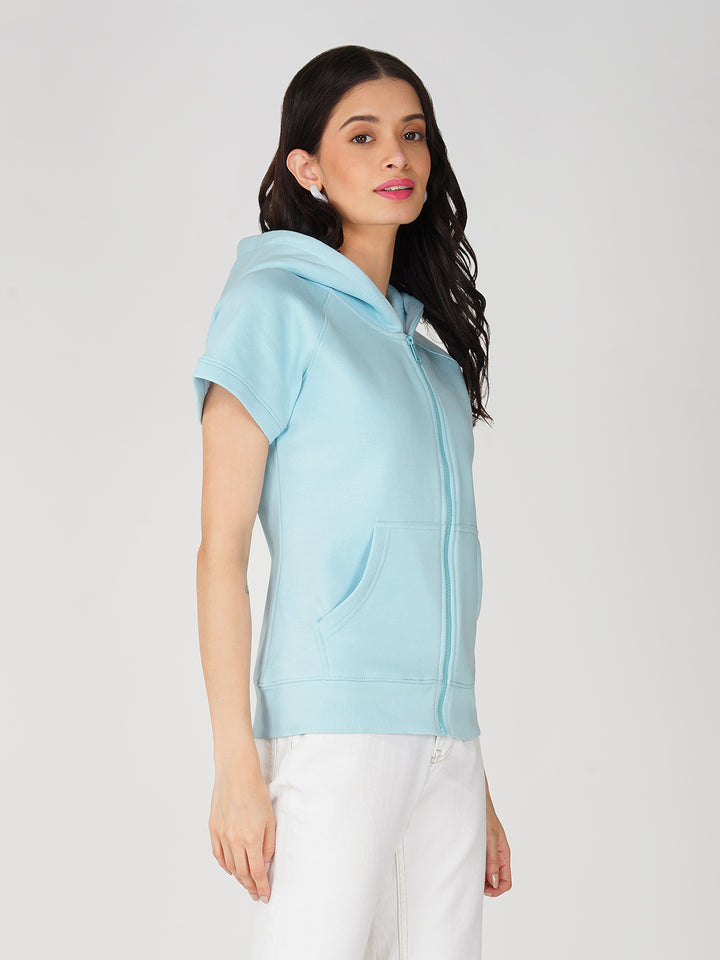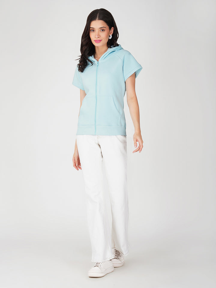 Trendy Full Zip Jacket for Women - Half Sleeve and Side Pocket with Hood