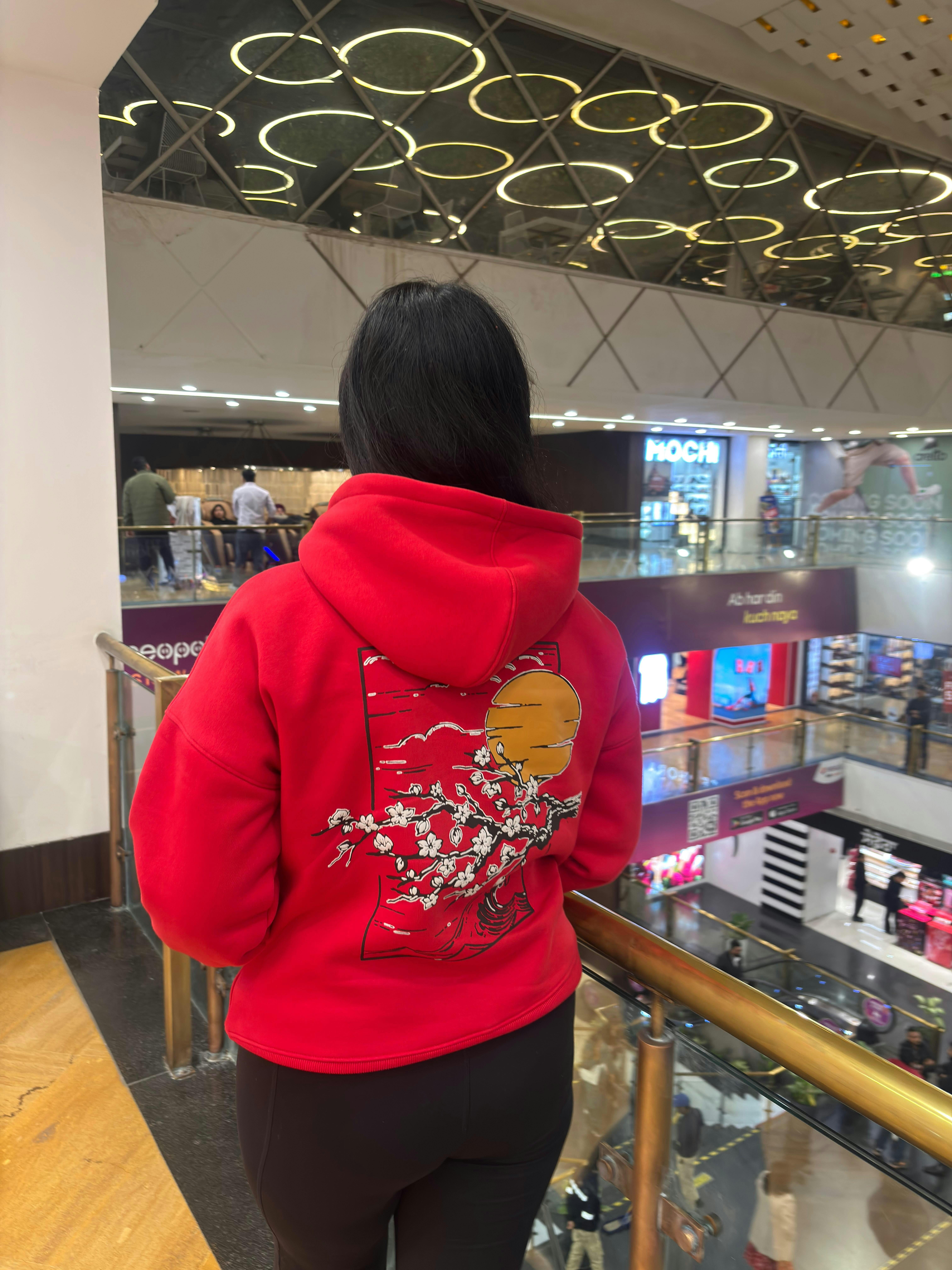 Elevate your casual look with this cozy oversized hoodie featuring a stunning Japanese-inspired back print. Designed with soft fleece fabric, dropped shoulders, and a relaxed fit, this cream hoodie brings together comfort and style. The bold red sun, blooming cherry blossoms, and ocean wave artwork add a touch of artful elegance to your everyday wear.